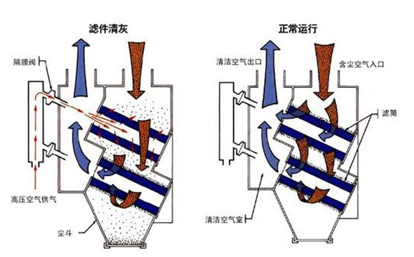 濾筒式除塵器的結構是由進風管、排風管、箱體、灰斗、清灰裝置、導流裝置、氣流分流分布板、濾筒及電控裝置組成,類似氣箱脈沖袋除塵結構。